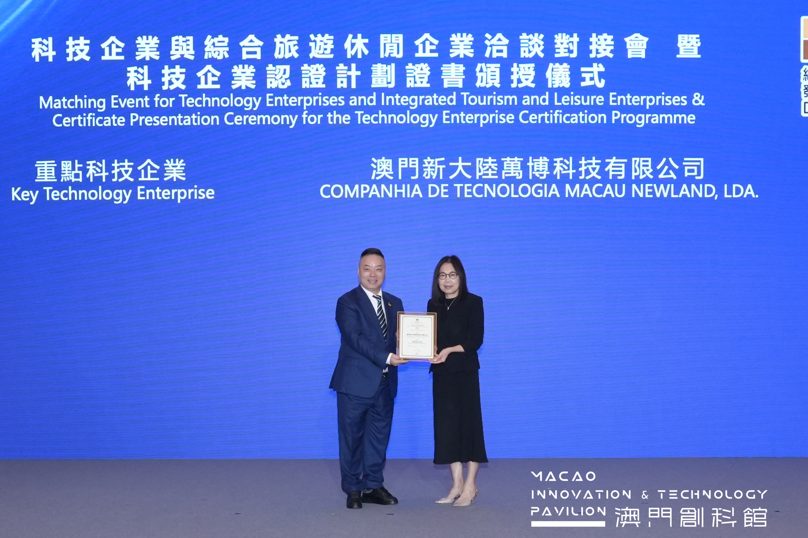 12月5日,由澳門特區(qū)政府經(jīng)濟及科技發(fā)展局(下稱"經(jīng)科局")和科學(xué)技術(shù)發(fā)展基金共同主辦的"科技企業(yè)與綜合旅游休閑企業(yè)洽談對接會暨科技企業(yè)認證計劃證書頒授儀式"在澳門威尼斯人酒店舉行。經(jīng)過嚴(yán)格篩選與評審,澳門新大陸萬博成功獲評為《科技企業(yè)認證計劃》——"重點科技企業(yè)"。經(jīng)科局代局長鄭曉敏為獲認證企業(yè)頒獎,公司總經(jīng)理劉金東出席儀式并領(lǐng)取證書。