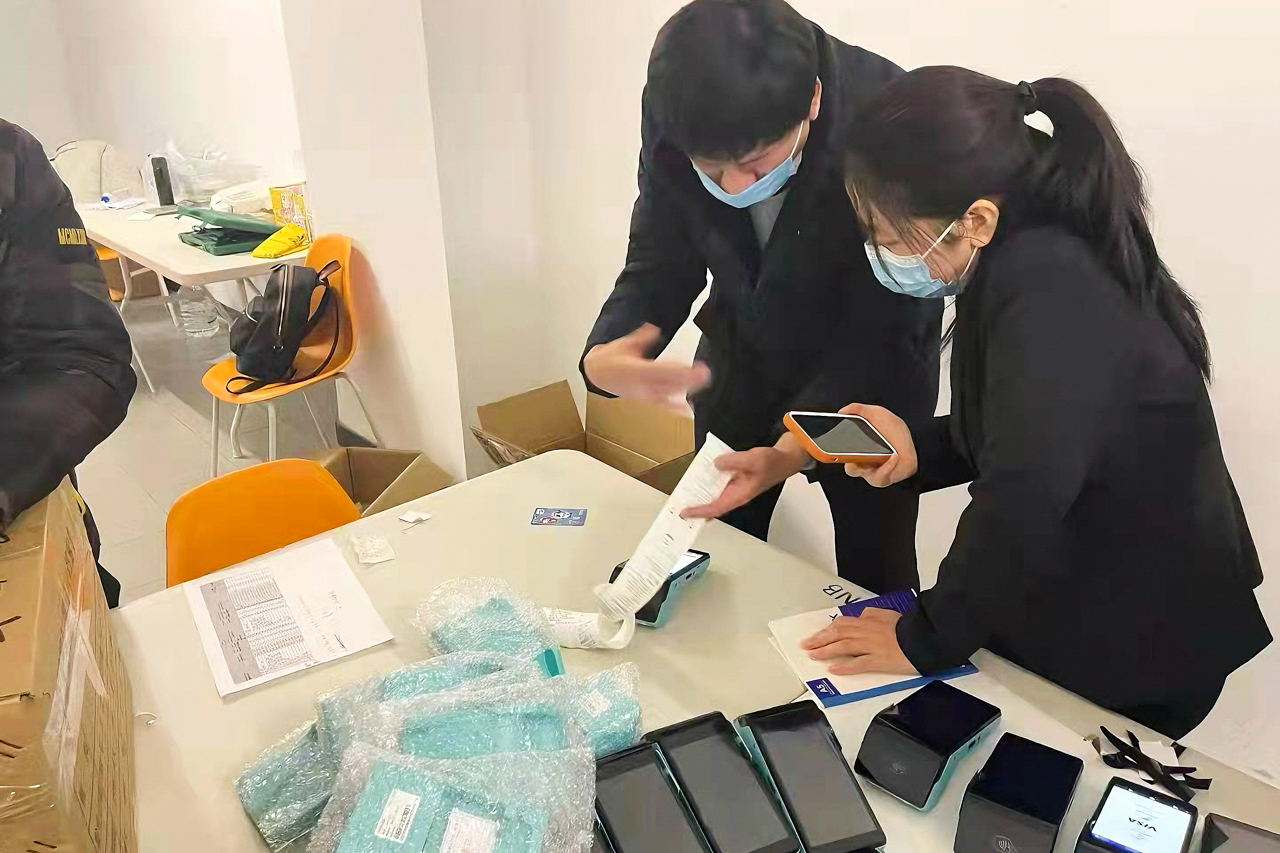 新大陸工作人員在冬奧村調試支持數字人民幣的POS設備